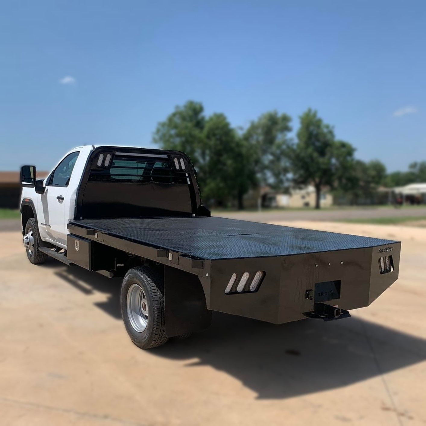 Our RR Rub Rail Flatbed is our heavy duty solid steel flatbed built triple tough with a tubular headrack, LED lights, Gooseneck hitch and more Ready To Work features.